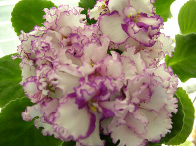 Волнистые простые и полумахровые белые анютины глазки с малиновой каймой. Мощные цветоносы. Цветение обильное и продолжительное. Листья светлые. Выставочный сорт.