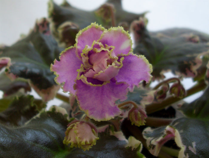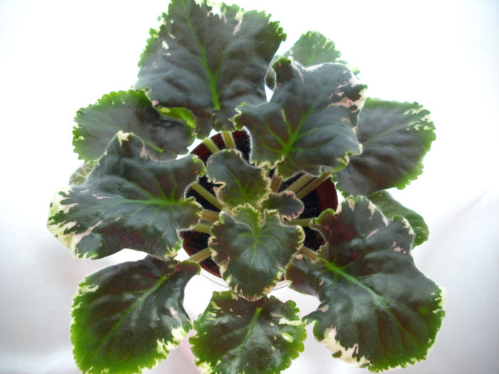 Очень крупные махровые темно-фуксиевые цветы с зеленой гофрированной каймой. Пестролистник.