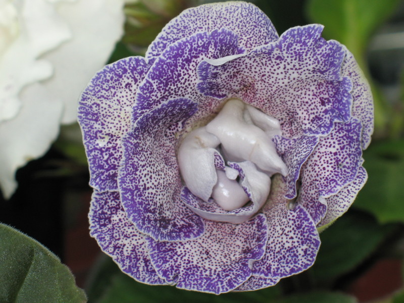 Махровая тигрина с более темно-синей каймой из плотного крапа и синий мелкий крап по белому полю.