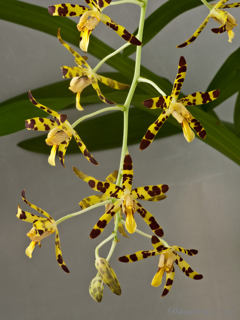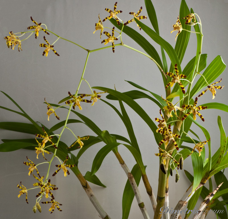 Анселия Африканская (Ansellia Africana) – довольно крупное растение, высотой до 1 м. Туберидии цилиндрической формы, 2,5-3 см в диаметре. Цветение – многоцветковая хорошо разветвленная кисть длиной до 50 см. Цветы 4-6 см в диаметре, желтые с коричневыми «леопардовыми» пятнами. При выращивании в комнатных условиях Анселия Африканская – одна из самых неприхотливых орхидей. Не имея периода покоя, цветет непрерывно, круглый год, при влажности воздуха 50-60%.